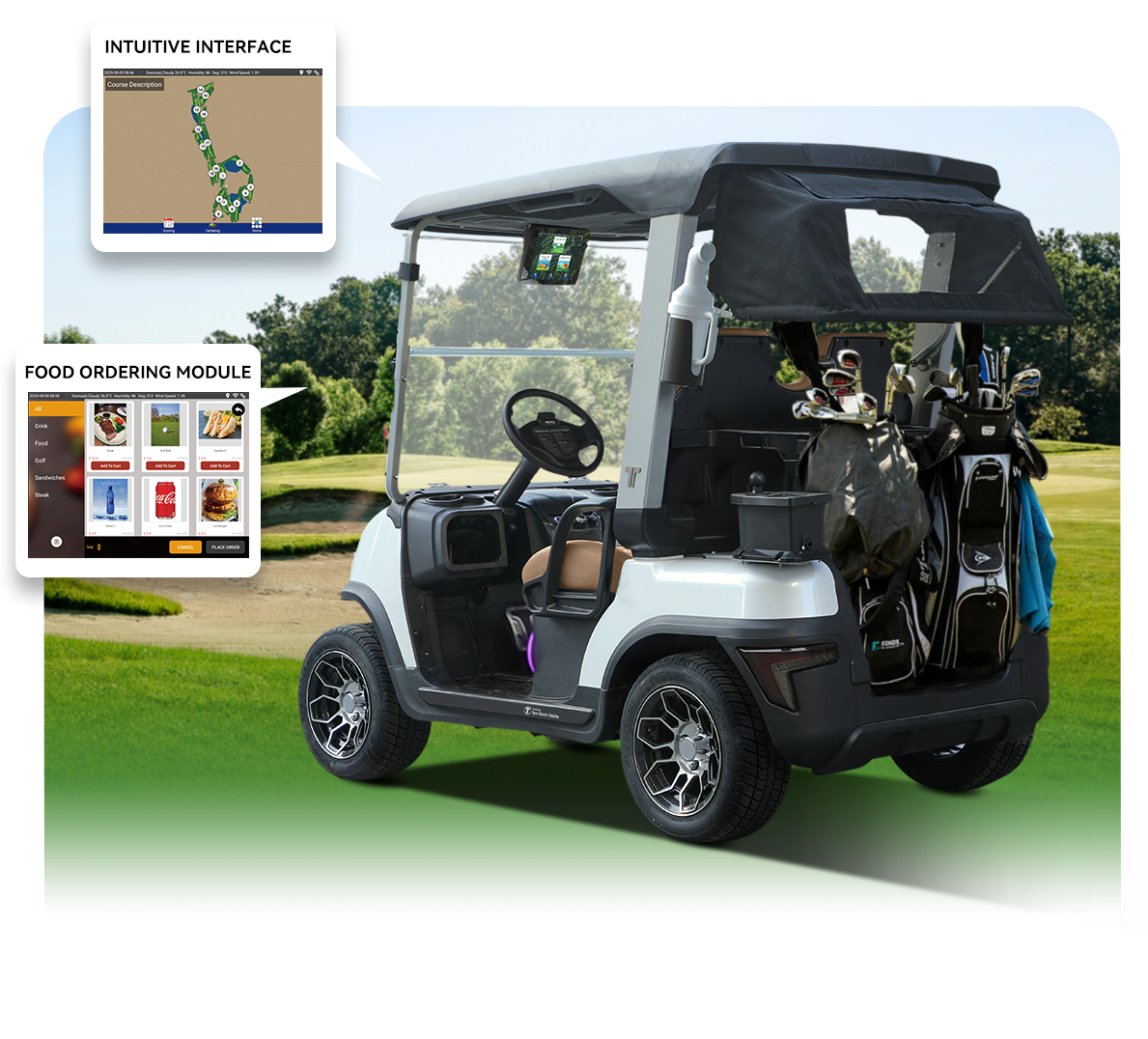 High-quality Bluetooth audio systems let you stream music, podcasts, or audiobooks directly from your phone. Multiple speakers are strategically placed for clear, balanced sound even while moving. Volume and track controls are accessible from the touchscreen or steering wheel, so you can keep your focus on the game while enjoying your favorite entertainment during the round.